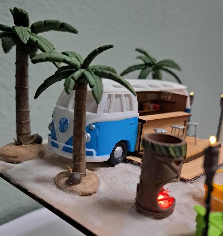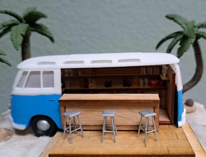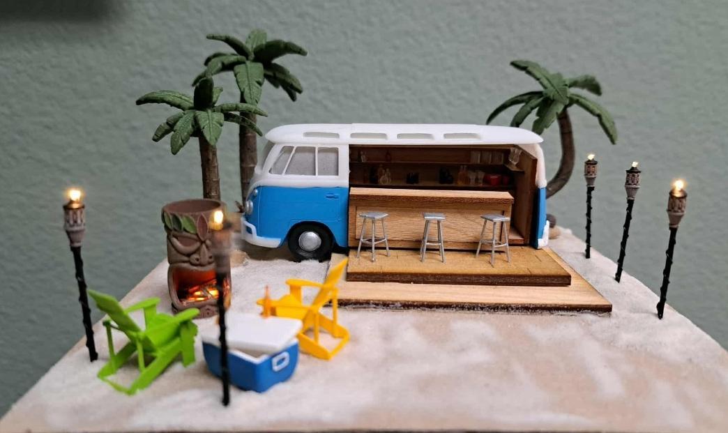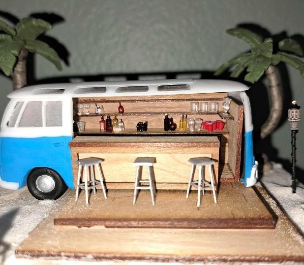 Spend the day at the beach, sipping drinks and relaxing. In this class, you will build the converted VW bus, make the bar and get plenty of bottles and other glassware to fill it up. Everything you see in the photo is included in the workshop. There will be homework to do before the convention. Students will receive the VW bus and the tiki fire pit before the convention. I will host a zoom to show how to remove the supports from the bus and tiki fire pit, and show you how I painted them. These will NEED to be painted before you get to convention to save time. I am also flying and will not have a lot of paints with me so bring your favorite colors with you. The size is approximately 6"W x 6”D x 6"H.