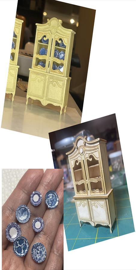 The painter Monet loved this style so much that there are several hutches like these in his farmhouse in Giverny, France. His are painted yellow and house his blue willow plate collection. You will assemble this maple laser-cut kit, paint it, and make your own blue willow style plates from coated paper pressed in a 3D plate press. The plate press is yours to keep for your next project. The finished size is approximately: 2” x 5”