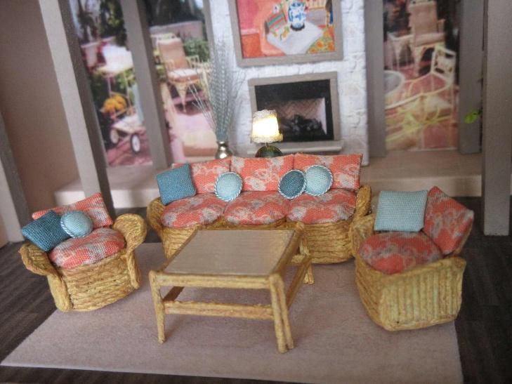 Weave this white wicker settee in ½” scale and learn seat upholstery techniques. The finished size is approximately: 3”L x 2.5”H x 1-1/4D