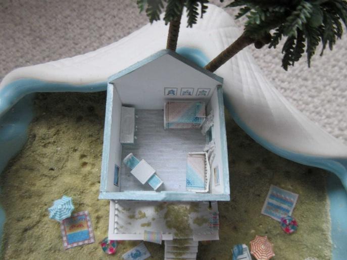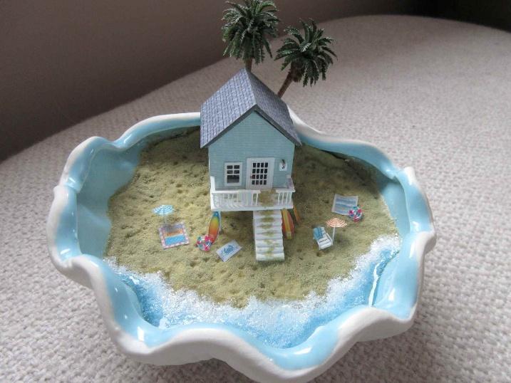 This is a British style beach hut in a ceramic shell. We will be landscaping the beach inside the shell, building a 1:144 scale beach hut from scratch. We will furnish the inside of the hut using laser cut kits from SDK Miniatures. We will be building the deck, railing and stairs from scratch. We will apply the sand for the beach, paint the waters edge and apply resin to give the water a very realistic look. The finished size is approximately: 6”W x 7”D x 4.5”H