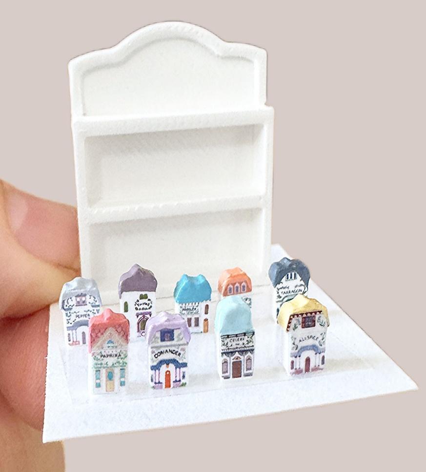 Join us to make a charming 1:12 scale vintage spice village set, complete with a small display rack. We’ll cut, assemble, and paint tiny spice “houses” that look adorable in any dollhouse kitchen or miniature scene. The finished size is approximately: 1.5”L x 1/2”W x 1.5H