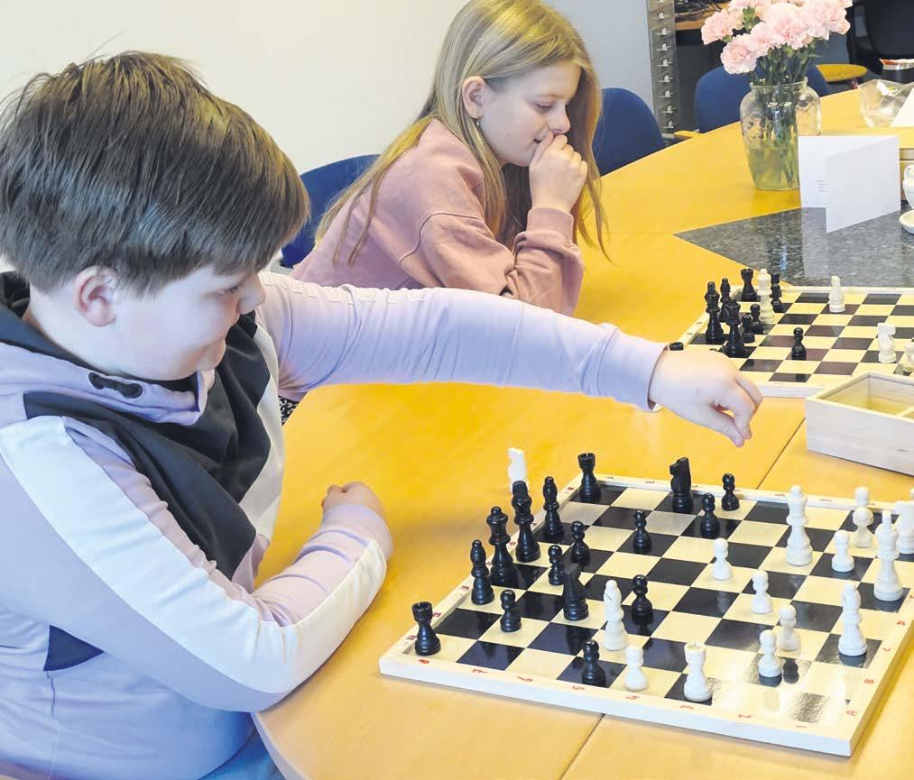 Marit, Maarten en Jan-Mark schaken sinds 1,5 jaar. Christiaan schaakt sinds 1 jaar. ‘We schaken iedere donderdag op een vast moment’, zegt Christiaan. ‘En als je klaar bent met taal of rekenen, dan kun je op de Chromebook tegen elkaar schaken’, zegt Marit. ‘Dat programma heet Chessity. Je kunt daarin examens doen en zo steeds op een hoger niveau schaken’, vult JanMark aan. ‘Als je samen met iemand anders klaar bent, kun je elkaar ook een chat via Teams sturen. Dan kun je samen de klas uitgaan en op het bord schaken’, vertelt Maarten.