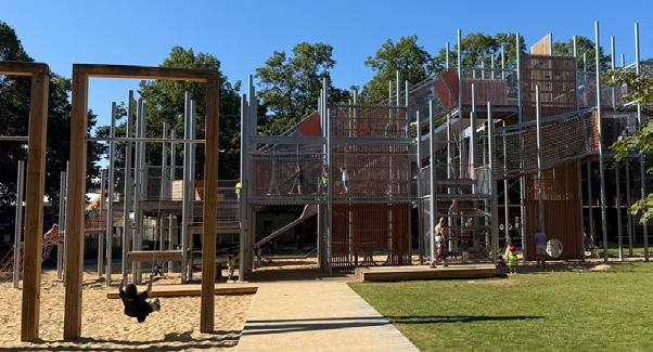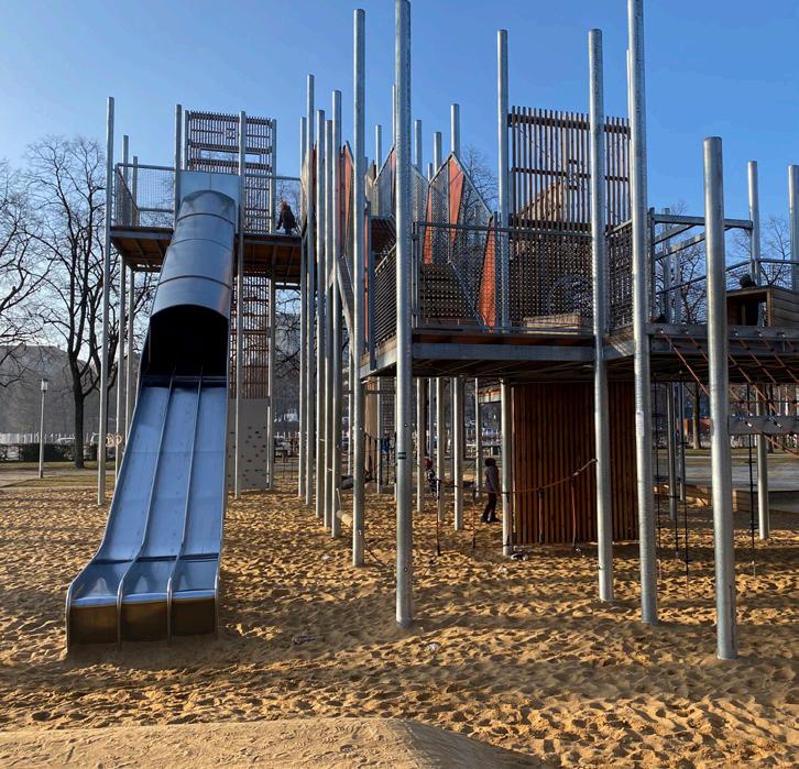 Der im Sommer eröffnete Spielplatz an der Theresienwiese ist mit vielen Kletternetzen, Brücken, Rampen und Schaukeln der größte, der je in München entstanden ist – und das ist auch wörtlich zu verstehen: Der Rutschenturm ragt 12 Meter in die Höhe!