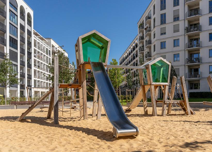 Im neuen Quartier am Nockherberg ist ein Spielplatz entstanden, der eher für kleinere Kinder gedacht ist – mit einem Heckenlabyrinth, einer Rutsch-Kletter-Kombi, Spielhäusern aus Holz und einem rollstuhlgerechten Karussell.