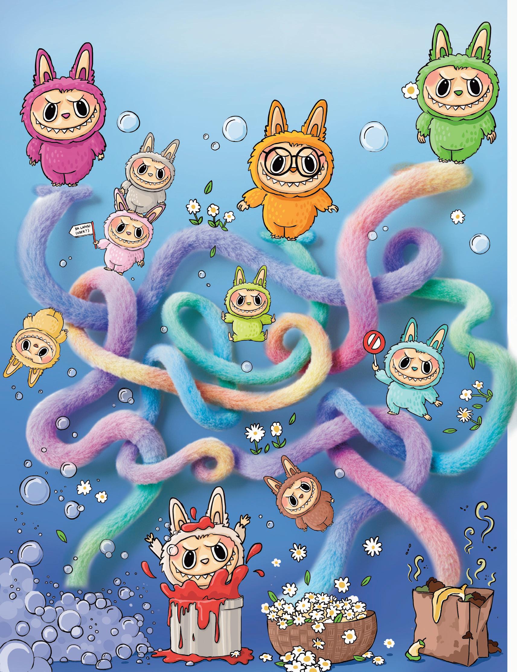 Rosa-Labubu liebt Blumen und Grün-Labubu Schaumblasen. Sind sie auf dem richtigen Weg? Deine Hilfe ist hier mehr als fällig, äh fellig! Und wird Orange-Labubu in der Komposttüte landen? Dann ist vermutlich Schluss mit Grinsen!
