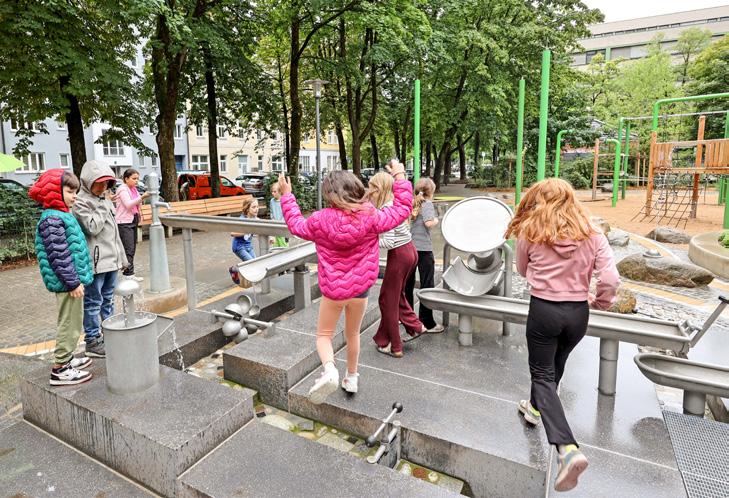Dass nun auch das Westend einen größeren Wasserspielbereich hat, verdankt es einem Kinder-Antrag beim „Kinder-Aktions-Koffer –Schwanthalerhöhe“. Toll: Die inklusiven Trampoline können alle Kinder nutzen, ebenso das Karussell und die Nestschaukel.