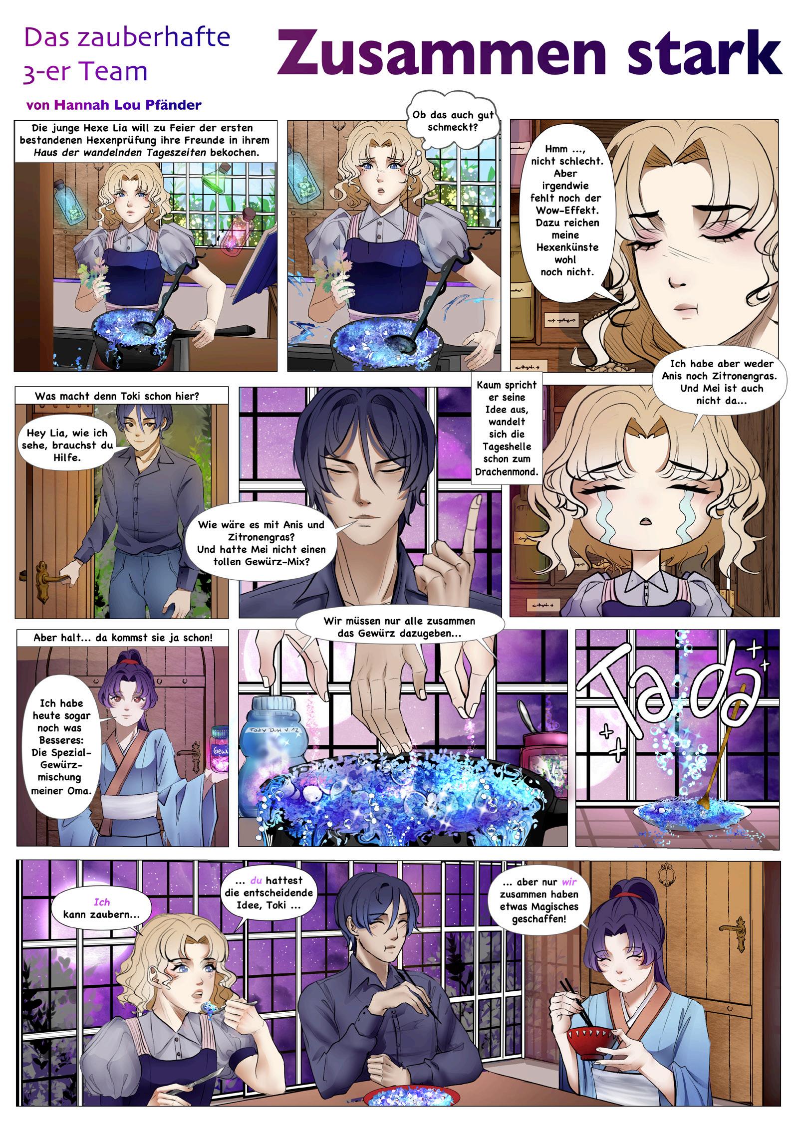 „Ich zeichne, seit ich 13 bin“, erzählt die nun 17-Jährige. „Damals habe ich das sehr viel gemacht, mindestens zwei Stunden am Tag. Jetzt, wo ich in der 12. Klasse bin, zeichne ich, wann immer die Schule es zulässt. Ich liebe Zeichnen, weil man nie auslernt und immer vor einer Herausforderung steht. So wie bei der ComicGeschichte mit dem magischen Essen .“