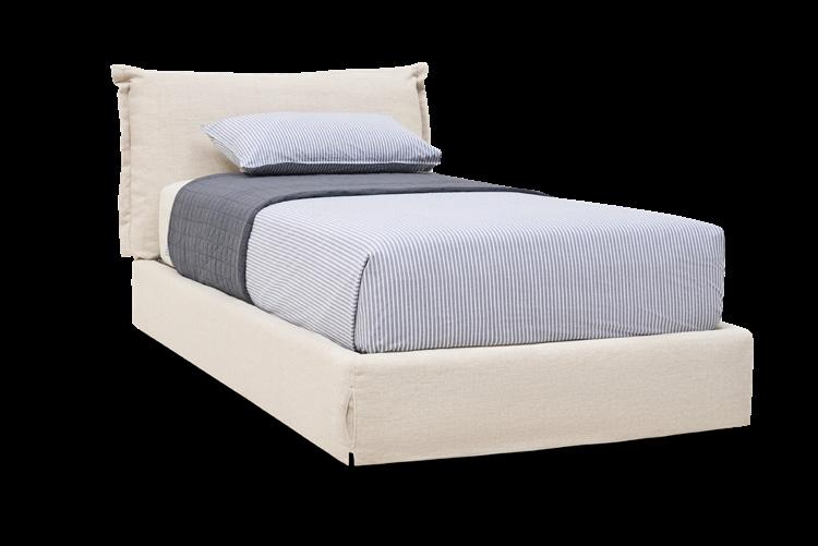 Contemporary by design, the plush twin bedhead is anchored by sculpted timber finish legs, while the slimline platform provides edge-to-edge mattress support.