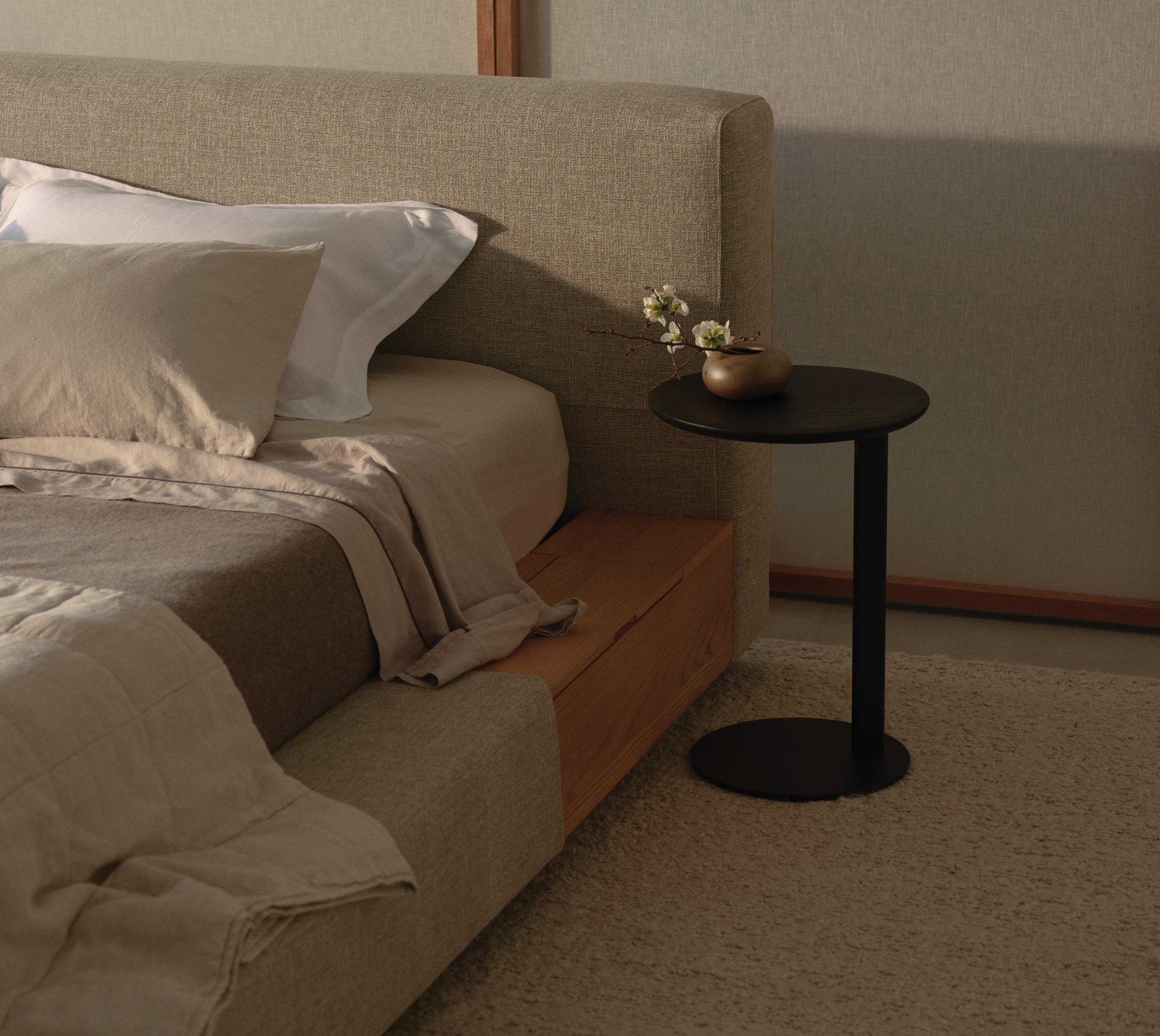 Featuring the Horizon Bed in Balmain Natural fabric, Myco Side Table in Smoked Oak timber, Origin Wollemi Bark Leather and Earth powdercoat, Myco Side Table in Smoked Oak timber and Earth powdercoat, Marion Rug in White