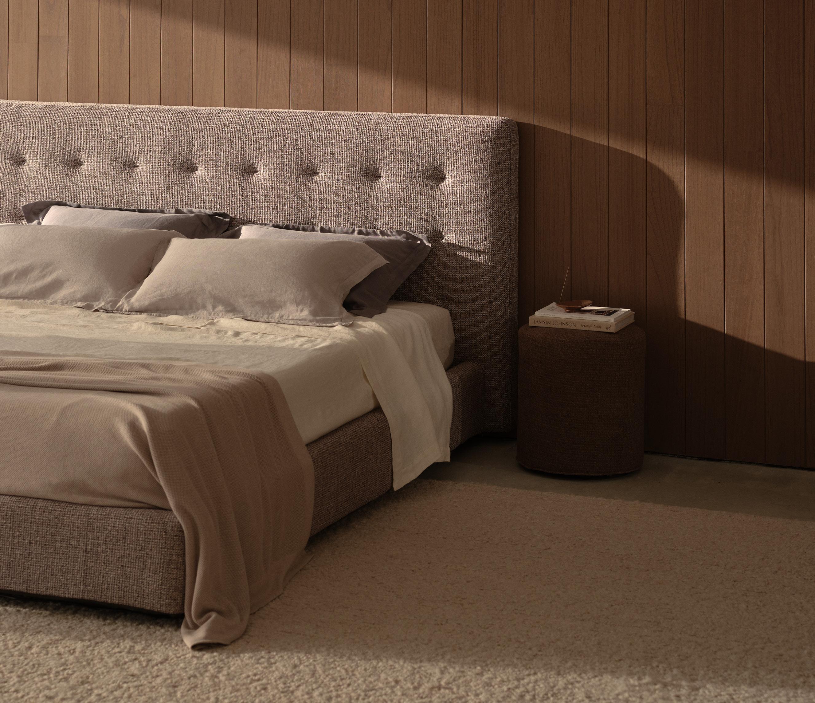 Featuring the Horizon Bed in Balmain Natural fabric, Myco Side Table in Smoked Oak timber, Origin Wollemi Bark Leather and Earth powdercoat, Myco Side Table in Smoked Oak timber and Earth powdercoat, Marion Rug in White