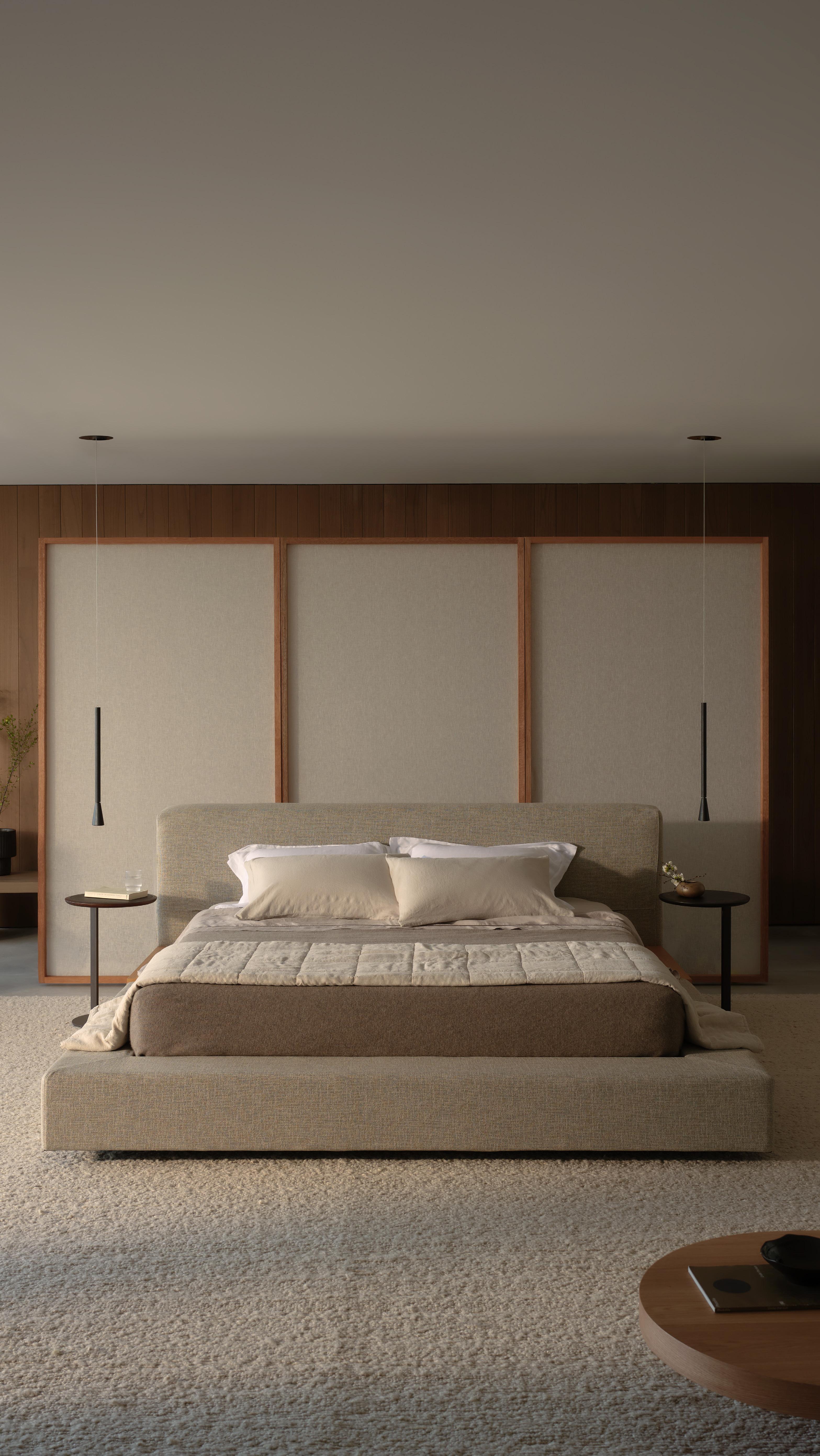Featuring the Jasper Bed in Bronte Sand fabric and Natural Oak timber shelves, Myco Side Table in Smoked Oak timber, Origin Wollemi bark leather and Earth powdercoat, Myco Side Table in Smoked Oak timber and Earth powdercoat, Spia Pendant Light in Onyx timber, Marion Rug in Sandstone.
