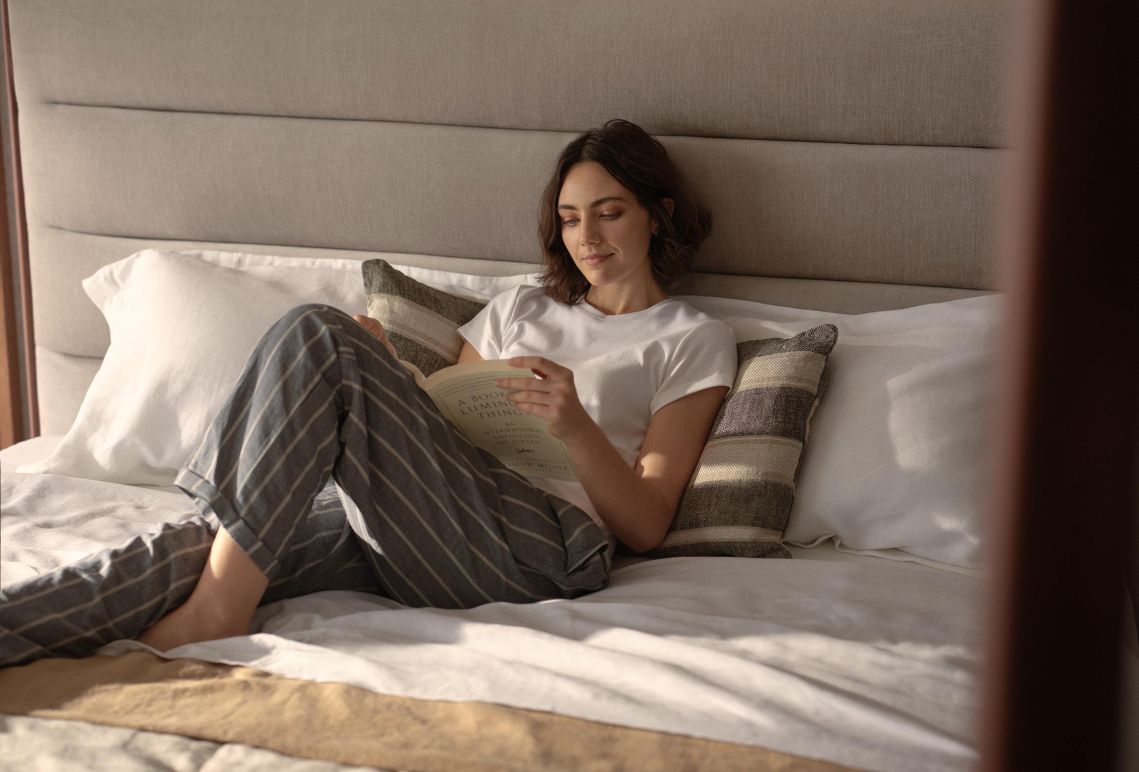 Featuring the Serenade Bed in Whiteley Greige fabric^, Bongo in Milton Fawn fabric, Marion Rug in Sandstone.