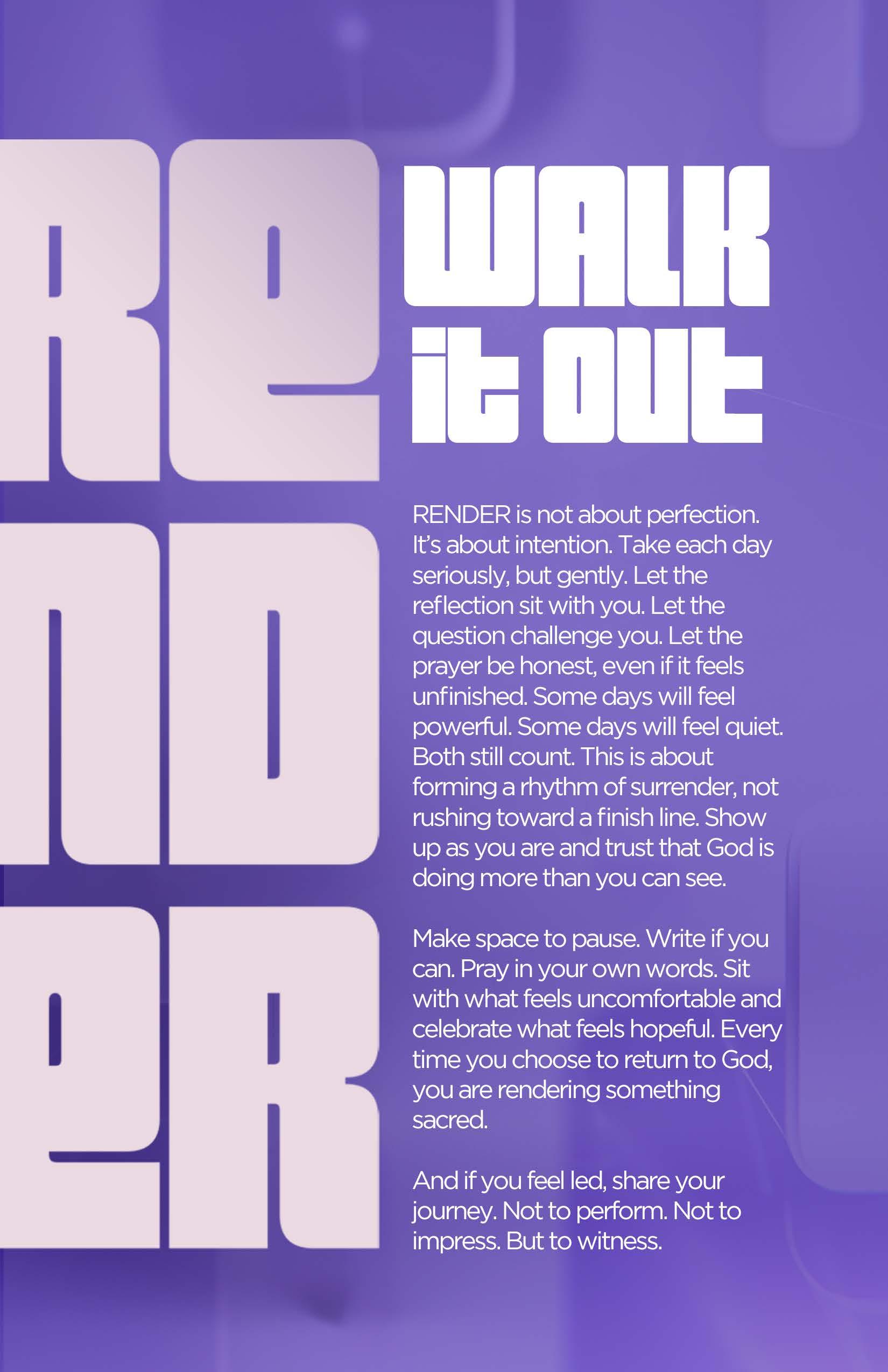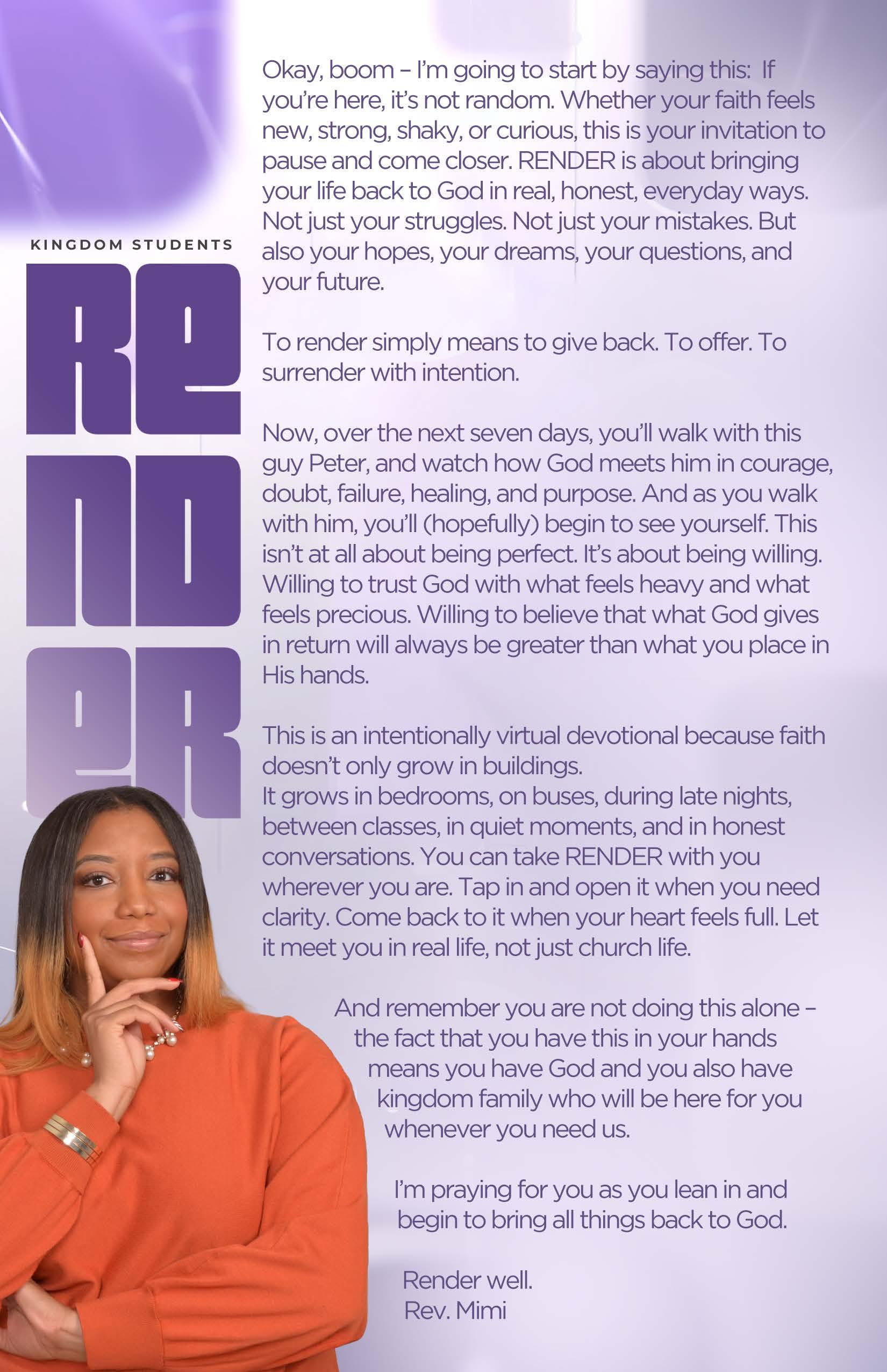 Peter loved Jesus, but he also loved his idea of who Jesus should be. He wanted a Savior who would protect, conquer, and win without pain, so when Jesus spoke about suffering, Peter tried to correct Him. Not because he lacked faith, but because he was afraid of a future that didn’t look like what he imagined. Rendering began when Peter had to accept that God’s plan would not always match his expectations. Sometimes we don’t struggle with trusting God, we struggle with trusting a version of God that doesn’t look the way we thought it would. We assume faith should feel clear, powerful, and predictable, but real faith also asks us to trust God in uncertainty and discomfort. Rendering your assumptions means releasing the picture you painted and allowing God to write something deeper. It means trusting that even when His plans stretch you, confuse you, or challenge you, they are still leading you toward growth, purpose, and life.