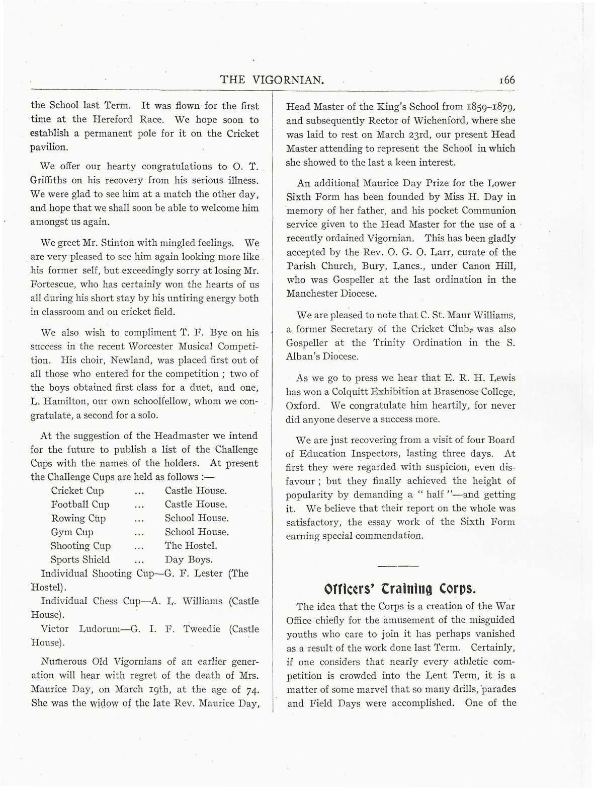 Numerous Old Vigornians of an earlier generation will hear with regret of the death of Mrs Maurice Day, on March 19th, at the age of 74 She was the widow of the late Rev. Maurice Day,