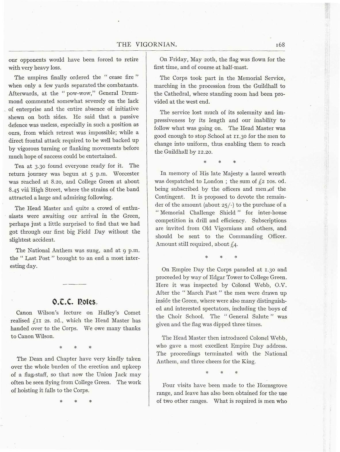 On the day of the late King's funeral the whole School attended the Memorial Service in the Cathedral The O.T.C marched to the Guildhall and there joined the other contingents marching to the Cathedral Special seats were reserved for those who were not members of the Corps