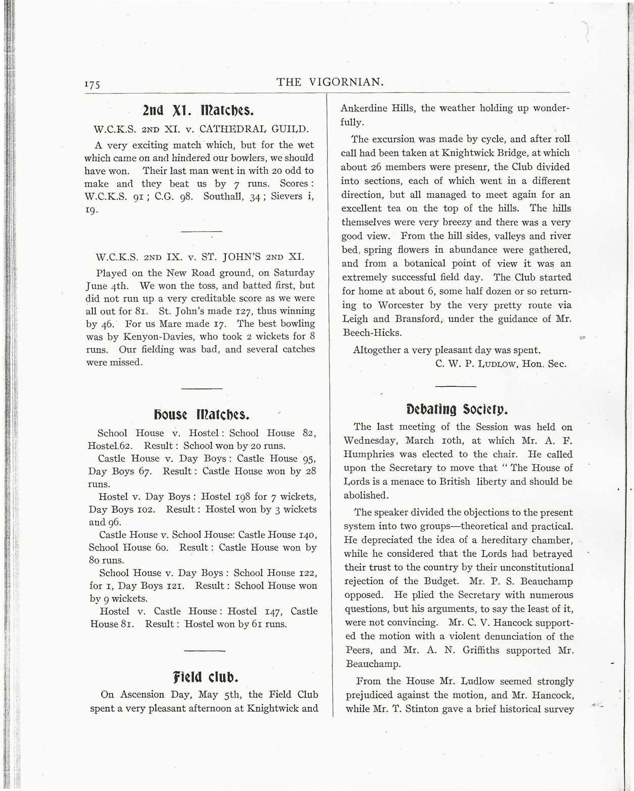Played at Worcester in splendid weather on June 15th Hereford winning the toss, batted first The start was sensational, Burr getting two wickets in the first over. This, followed by some steady bowling and admirable fielding, seemed to unnerve our opponents, who were all dismissed for the small score of 35 Only at one time did it ever look as if the bowling would be mastered, and then Davis by holding an awkward catch saved the situation The Worcester batsmen started none too confidently, but Burr and Aldana soon put the issue beyond all doubt Both batted well, Aldana scoring very fast, and bringing off some splendid late cuts. Burr was very steady, and towards the end drove with great power A word must be said for the excellent way in which Quin placed and controlled his field Nothing is more helpful to a bowler than for all the chances to come to hand— which they certainly did for the Worcester bowlers on this occasion