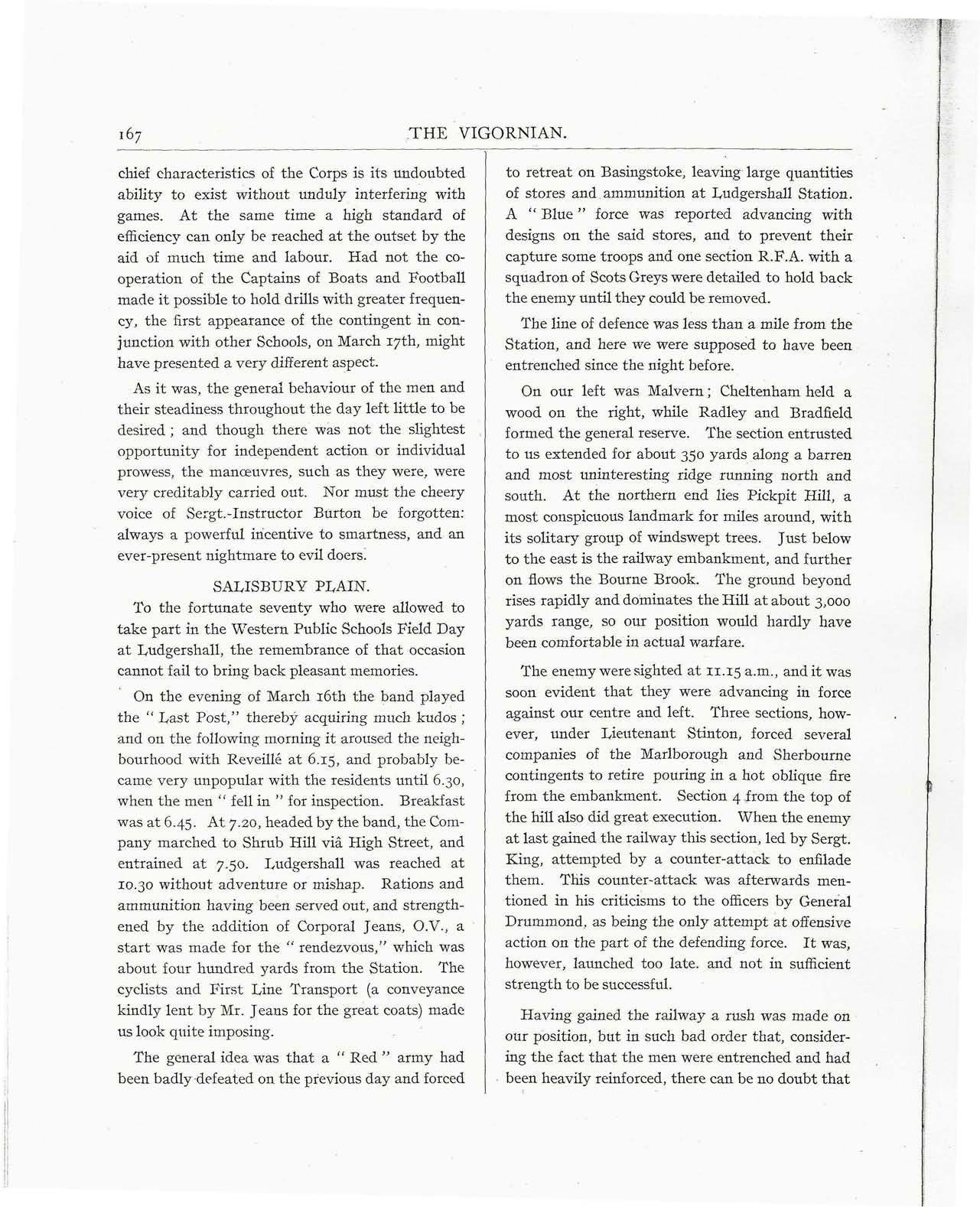 chief characteristics of the Corps is its undoubted ability to exist without unduly interfering with games. At the same time a high standard of efficiency can only be reached at the outset by the aid of much time and labour. Had not the cooperation of the Captains of Boats and Football made it possible to hold drills with greater frequency, the first appearance of the contingent in conjunction with other Schools, on March 17th, might have presented a very different aspect.