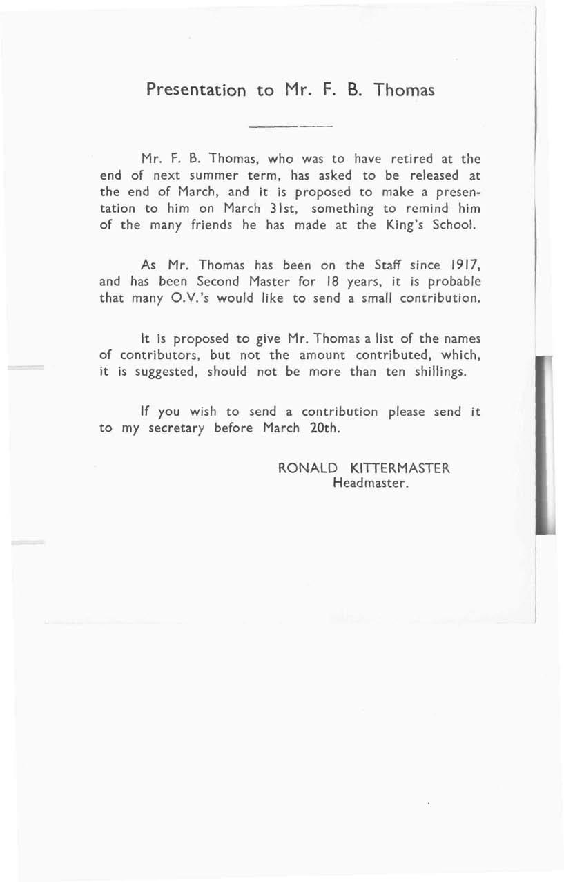Mr F B Thomas, wh o was t o have retire d at th e end o f nex t summe r term , has asked t o be released at th e end o f March , and i t is proposed t o make a presentatio n t o hi m on March 31st, somethin g t o remin d hi m o f th e many friend s he has made at th e King' s School
