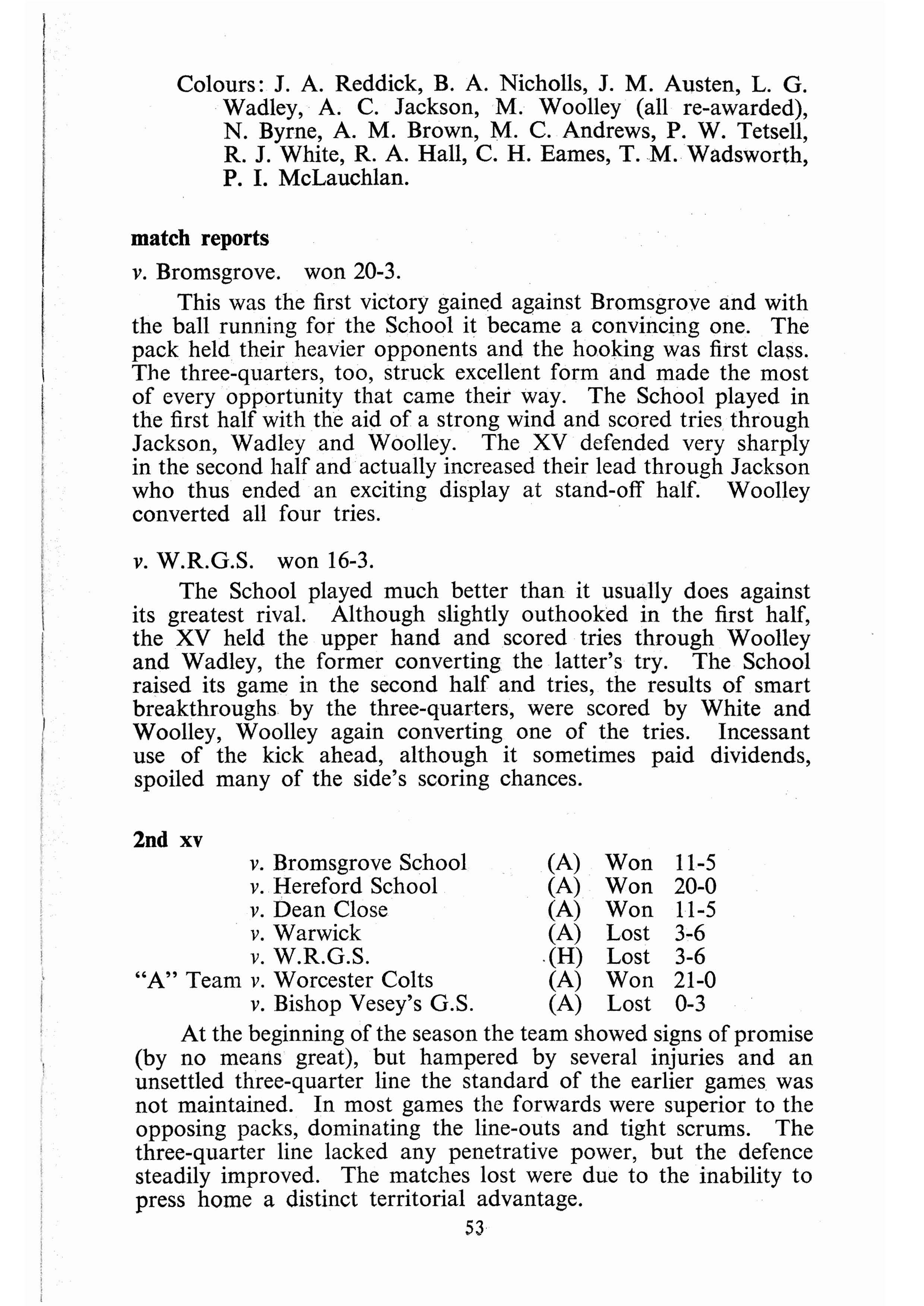 (H) v. Worcester T.C. won 28-0 (A) v. Bishop Vesey's won 11-6 (A) v. Magdalen ColI. S. lost 5-6 (H) v. Old Vigornians won 11-6