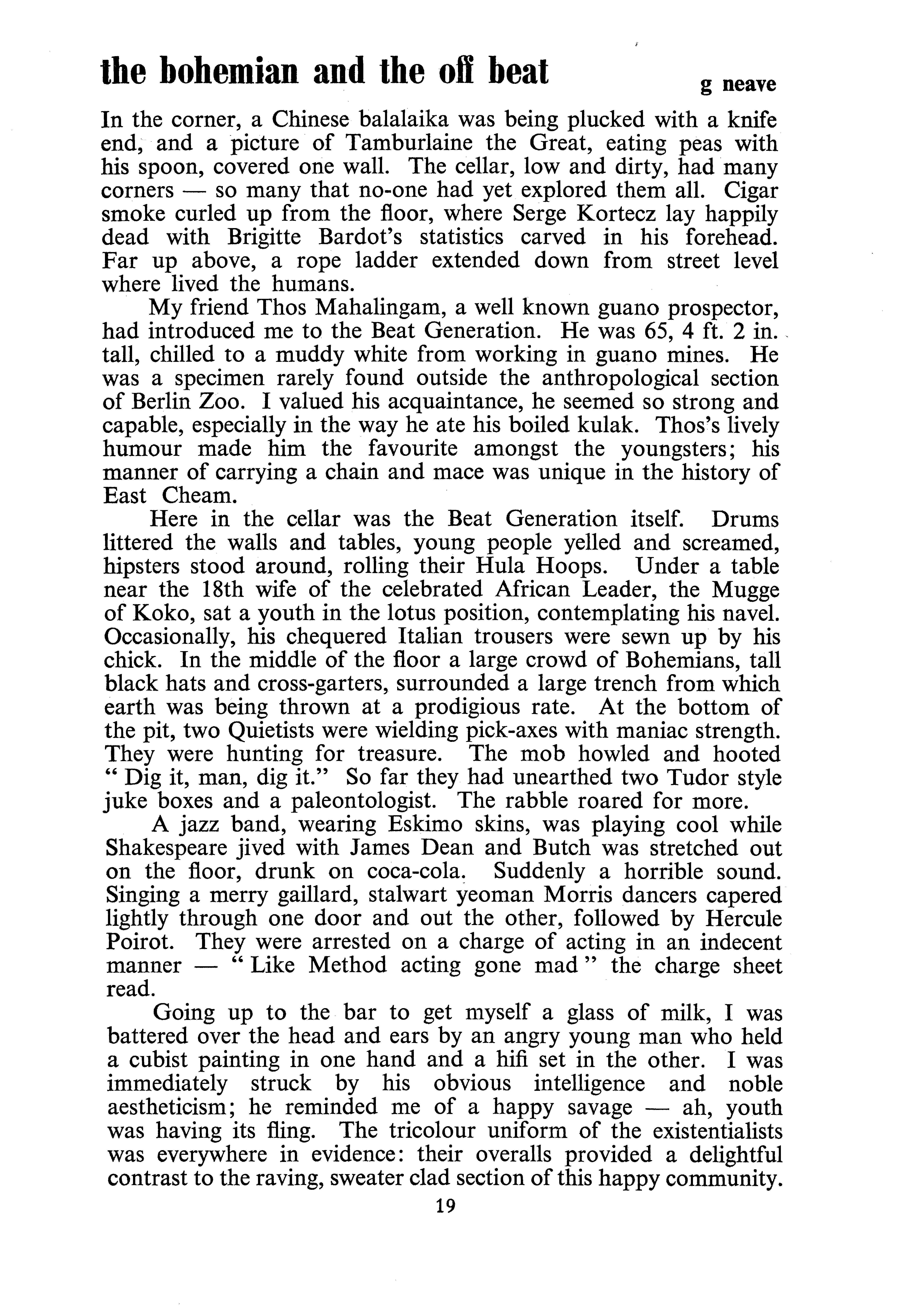 Here in the cellar was the Beat Generation itself. Drums littered the walls and tables, young people yelled and screamed, hipsters stood around, rolling their Hula Hoops. Ul1der a table near the 18th wife of the celebrated African Leader, the Mugge of Koko, sat a youth in the lotus position, contemplating his navel. Occasionally, his chequered Italian trousers were sewn up by his chick. In the middle of the floor a large crowd of Bohemians, tall black hats and cross-garters, surrounded a large trench from which earth was being thrown at a prodigious rate. At the bottom of the pit, two Quietists were wielding pick-axes with maniac strength. They were hunting for treasure. The mob howled and hooted " Dig it, man, dig it." So far they had unearthed two Tudor style juke boxes and a paleontologist. The rabble roared for more.