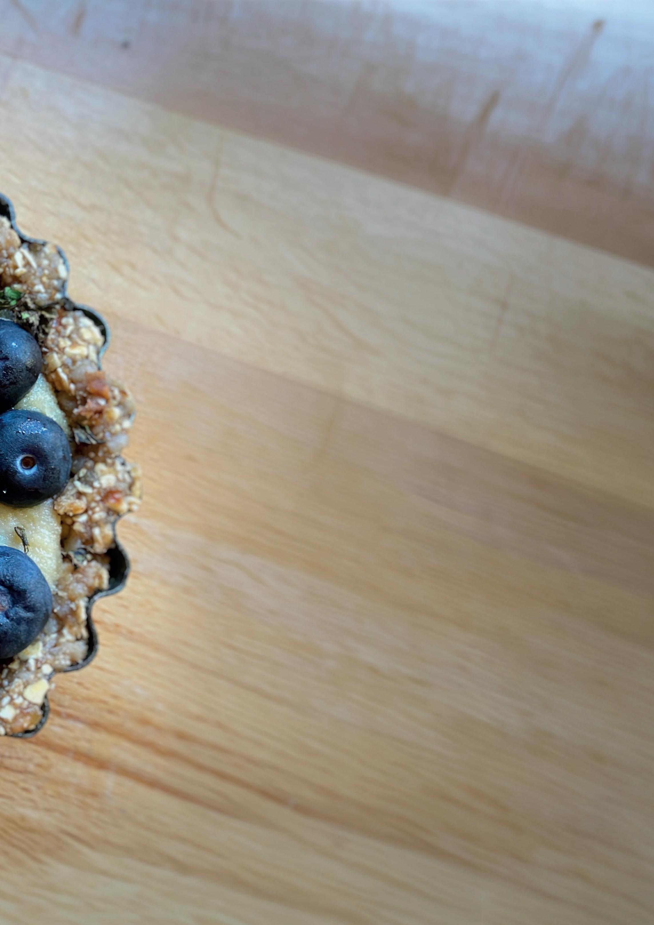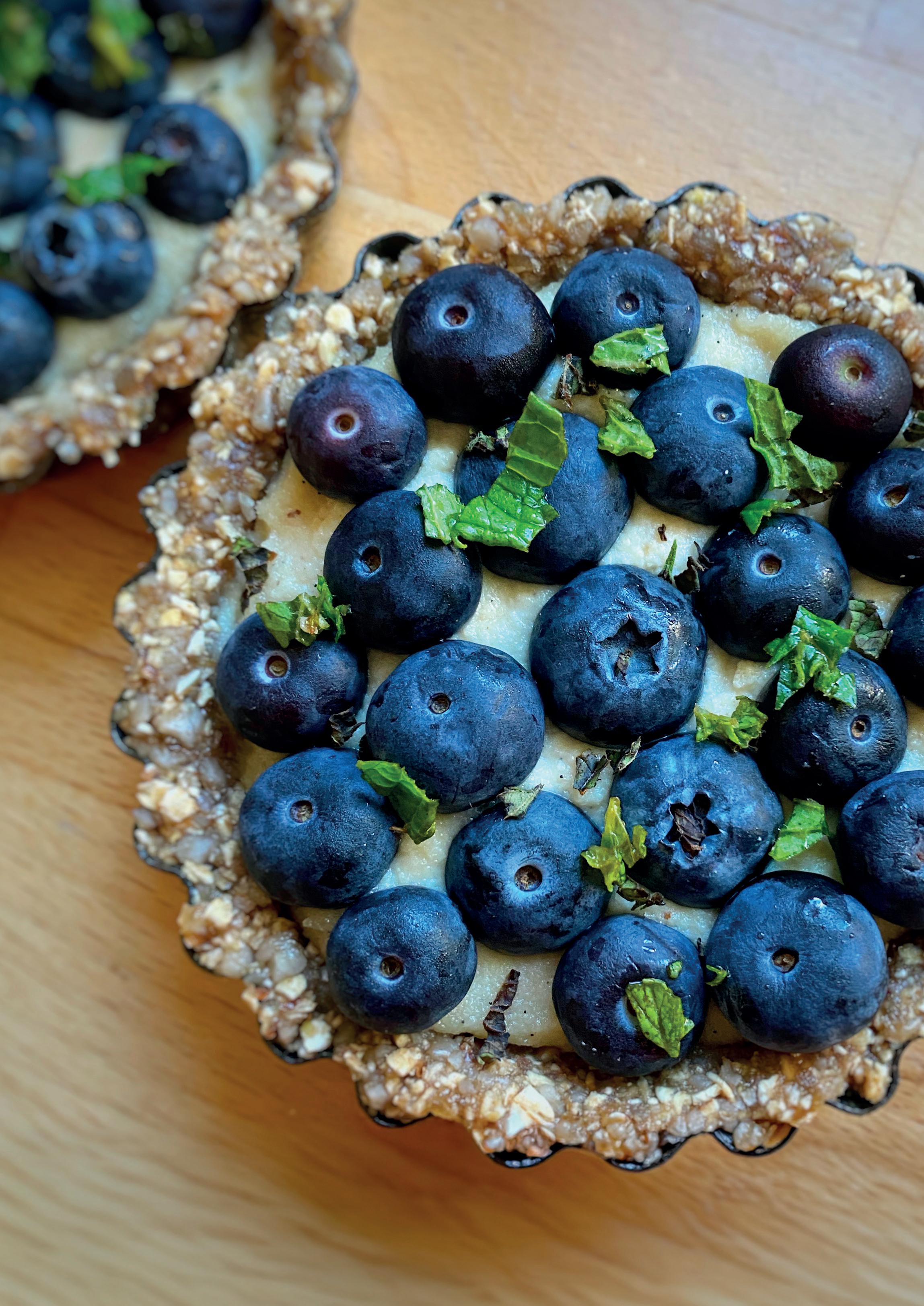 6. Remove the base cases from the fridge and fill with the cashew cream. Cover the tops with blueberries, then chill in the fridge until you are ready to serve.