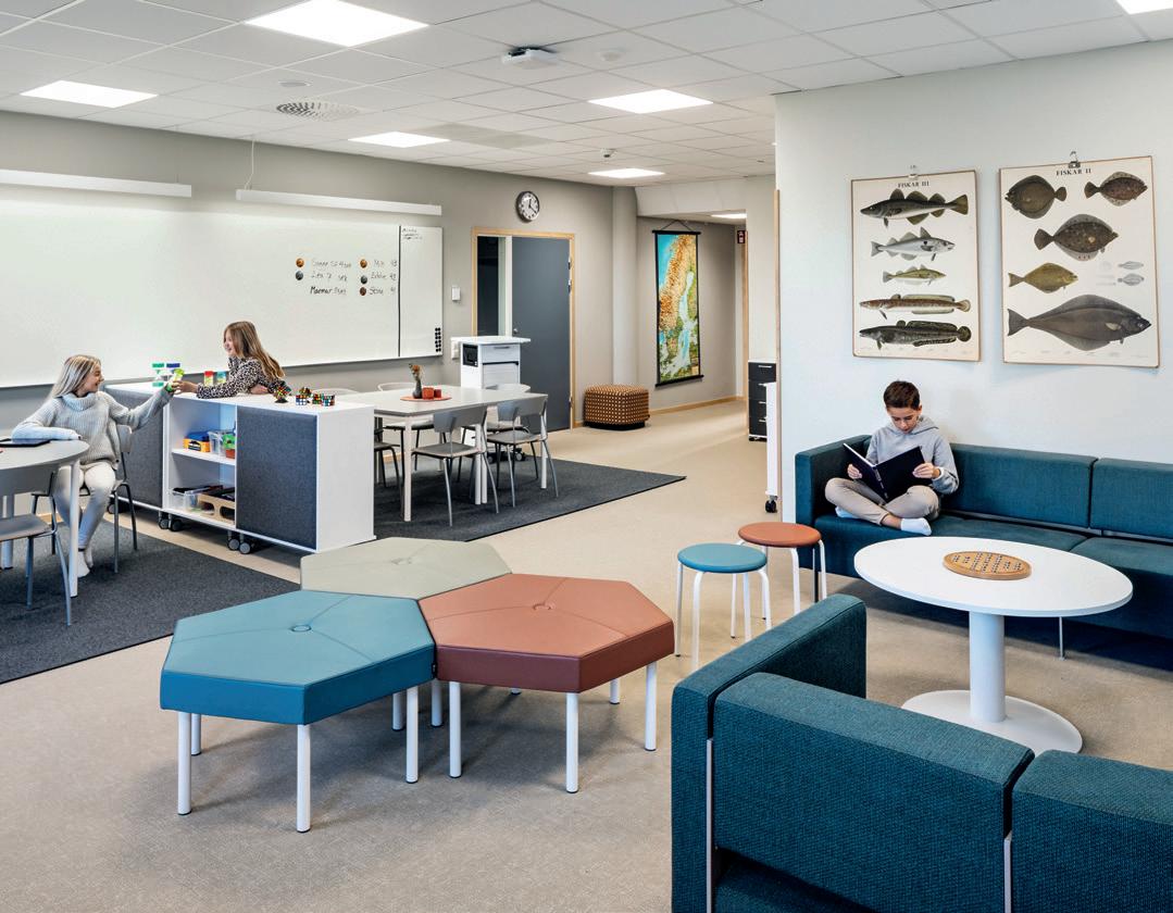 ANOTHER FUNDAMENTAL idea is that the learning space should be varied and customised to different activities and needs. There are many different learning situations during a school day, and the physical environment needs to support teaching, learning, focus and security in all of them. Kinnarps inspired the division into zones used by Amerikanska Gymnasiet.