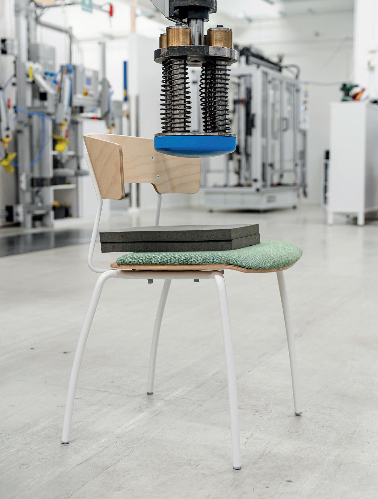 tested vertically and on the front edge and, depending on the part, there is a specific weight and a fixed number of cycles that should be used. The testing takes about three weeks from start to finish, and should correspond to the lifetime of a item of furniture for a person weighing up to 110 kilos in user weight.