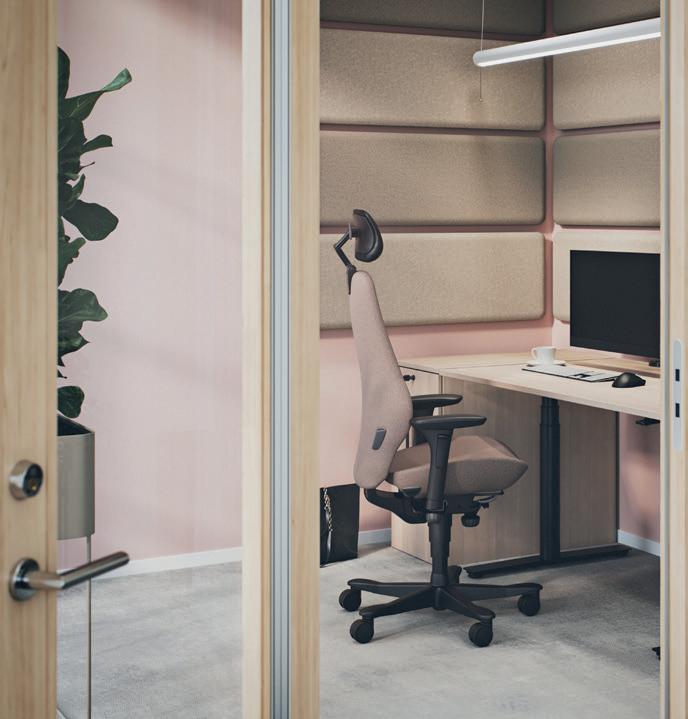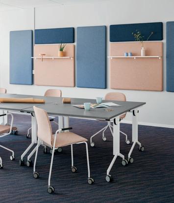 Schreibtische in verschiedenen Formen und zwei Höhen. Tischplatten mit schallabsorbierenden Eigenschaften und Rollen für zusätzliche Flexibilität.
