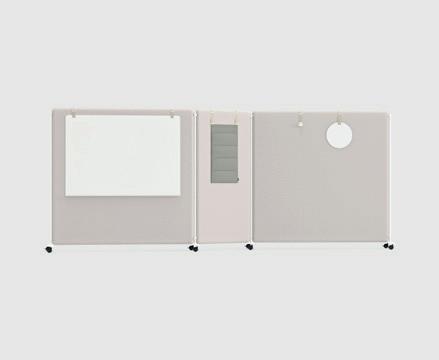 Des modules de rangement multifonctionnels sur roulettes qui peuvent également servir à diviser des pièces. Le dossier des modules peut être muni d’un tableau blanc ou d’un panneau acoustique.