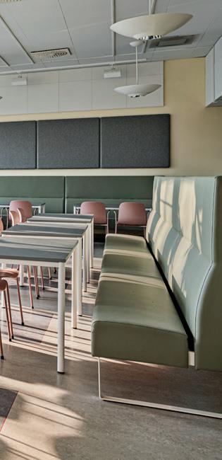 La cantine est en général utilisée quelques heures seulement pendant la journée, mais il est possible d’étendre son utilisation grâce à un aménagement diversifié. En divisant la cantine en différentes zones avec diverses solutions permettant de s’asseoir ou de se tenir debout, vous pouvez créer des espaces adaptés au travail individuel ou en groupe. La cantine étant un lieu particulièrement sujet à l’usure, veillez à sélectionner des matériaux résistants et facilement lavables. Créez un bon environnement acoustique en optant pour des meubles revêtus de tissu, des plateaux insonorisants et des panneaux acoustiques aux murs.