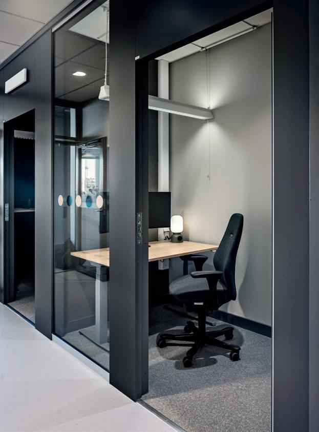 Un espace isolé qui peut être fermé ou faire partie d’un environnement ouvert. Il permet à une personne de s’installer pour passer des appels téléphoniques ou virtuels sur un ordinateur. Ici, l’installation d’un aménagement ergonomique et d’un système d’éclairage réglable offre des conditions optimales pour passer des appels courts ou longs.