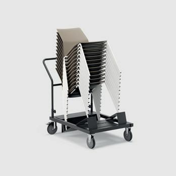 Une chaise en polypropylène et empilable avec un chariot. Facile à nettoyer et à désinfecter.