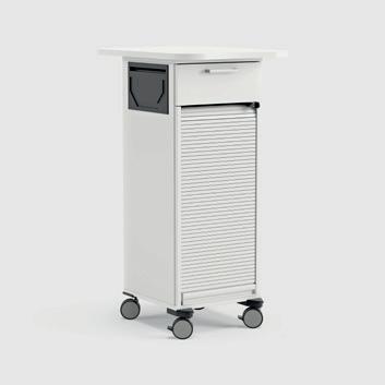 Un pupitre à roulettes facile à déplacer dans la pièce. Offre une surface de travail fonctionnelle et un module de rangement pratique, à portée de main.