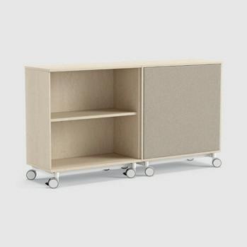 Monipuolinen pyörillä varustettu säilytyskaluste, jota voi myös käyttää huoneen jakamiseen. Taustaksi voidaan valita kirjoitustaulu tai ääntä vaimentava materiaali.