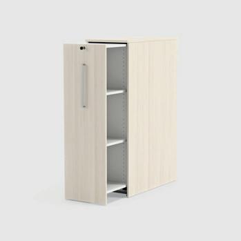 Opbergoplossing die in een aantal verschillende combinaties kan worden gebouwd. Gesloten deuren minimaliseren afleidingen en dragen bij aan een nette indruk.