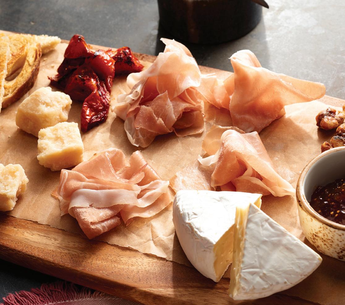 A colorful presentation of cheese, olives, cherry tomatoes, and cured meats. Serves 70 people.