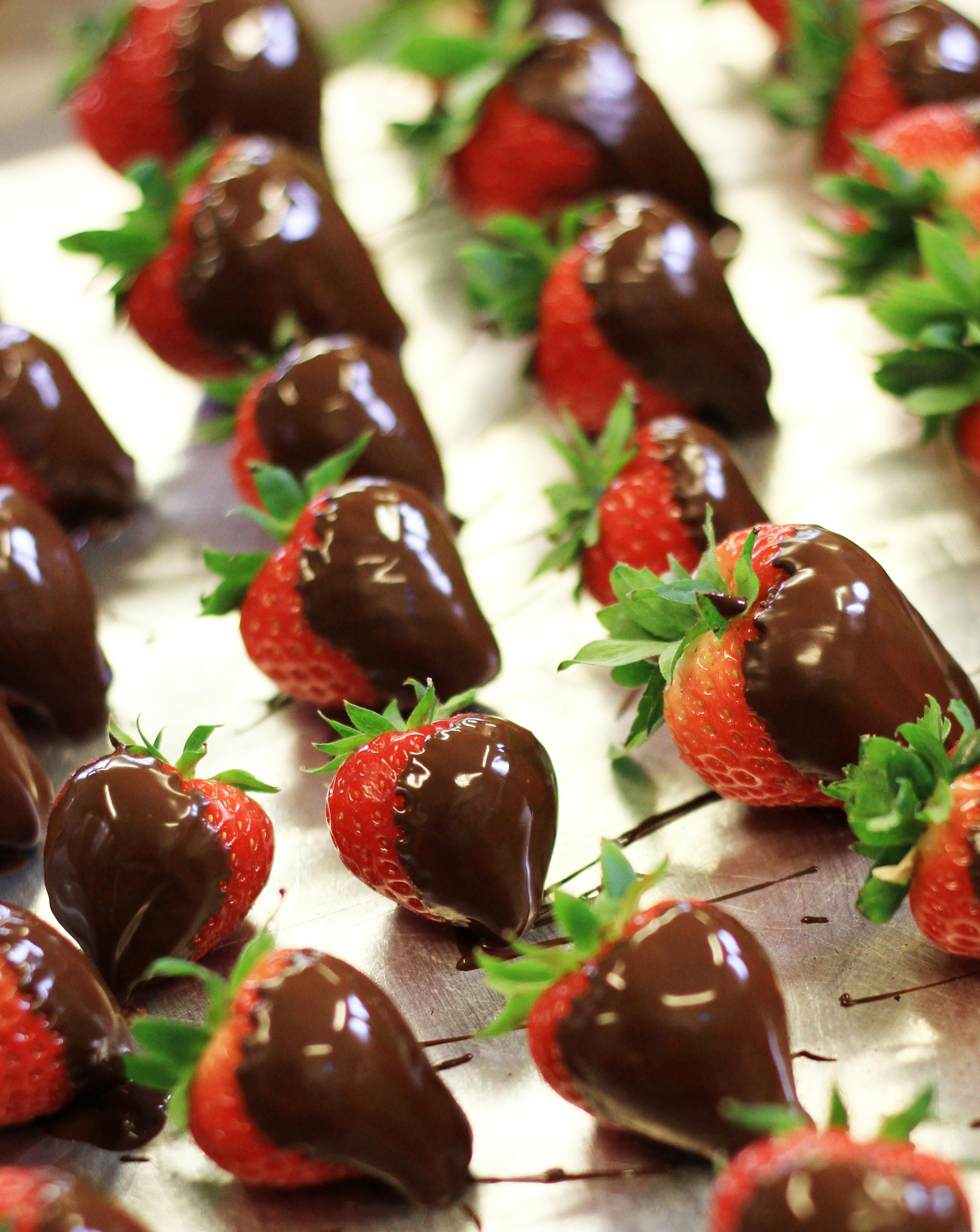 Regular and decaffeinated coffee, herbal tea, assorted soft drinks, bottled water, chocolate cookies and brownies, assorted chocolate candies, and chocolate dipped strawberries.