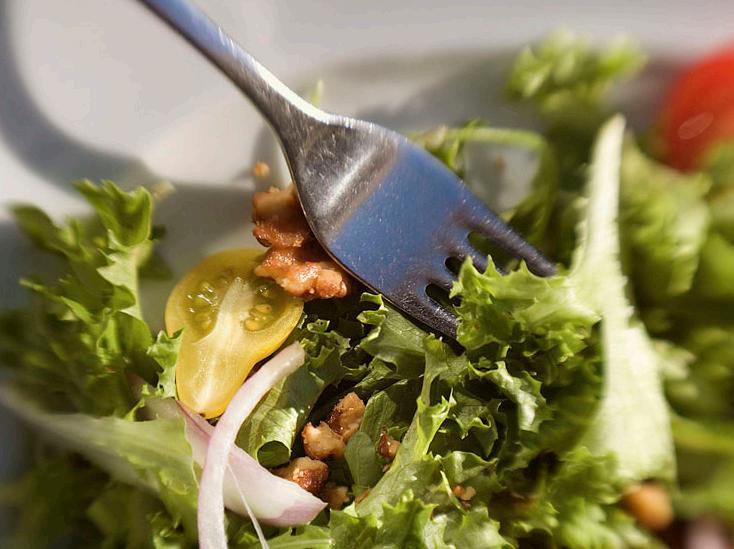 Tender baby spinach, and peppery arugula, tossed with cherry tomatoes, roasted butternut and finished with candied pecans, scrambled goat cheese, and drizzle of vinaigrette .