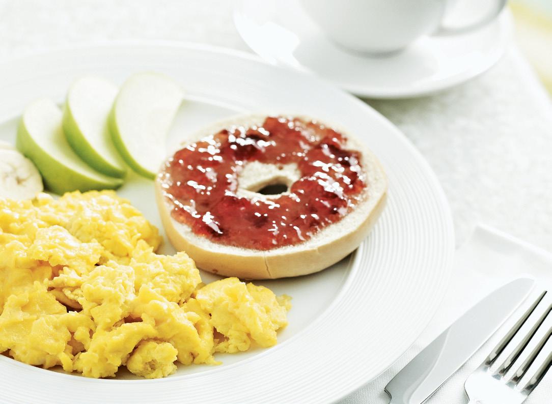 Regular and decaffeinated coffee, hot tea, accoutrements, assorted juices, fresh pastries, muffins, doughnuts, assorted bagels and cream cheese, jellies, and whole fruit.