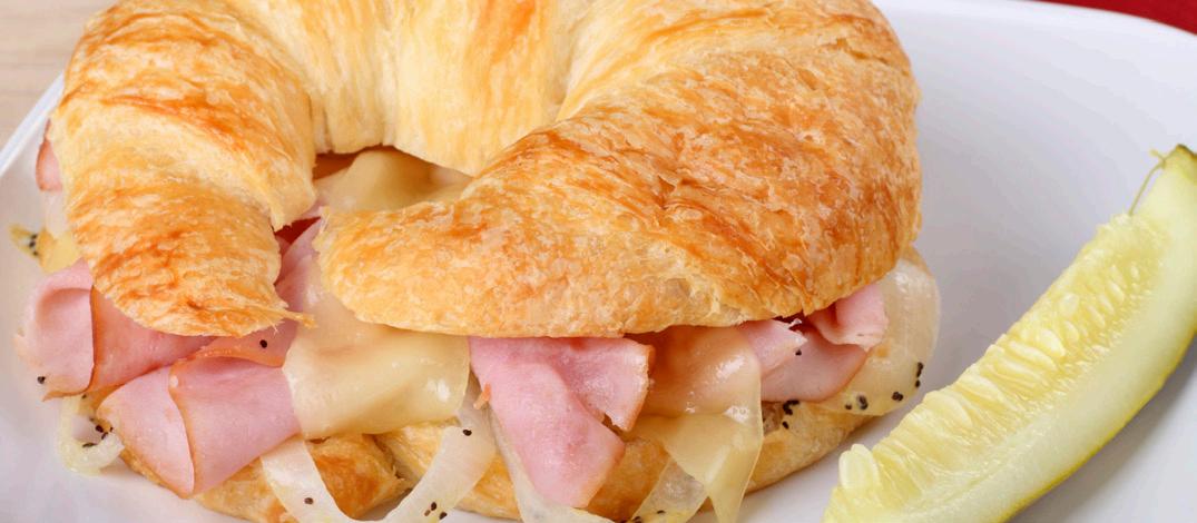 Sliced ham, pickles, Swiss cheese, whole-grain mustard, garlic mayonnaise, lettuce, and tomatoes. Served on a baguette
