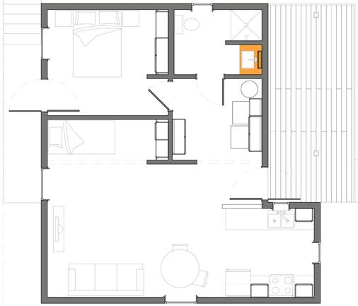 The team decided to adapt Joanne’s Home, a project built in 2011. One of Ms. Ophelia’ sons is in a wheelchair, so they altered the plan to include an FHA compliant entrance, kitchen, and bathroom. Also Ms. Ophelia’s preference for sleeping in her living room prompted the idea of a “quarter bedroom.” This quarter bedroom is essentially a nook built into the living room that provides privacy for Ms. Ophelia, while also allowing her to maintain her current lifestyle.