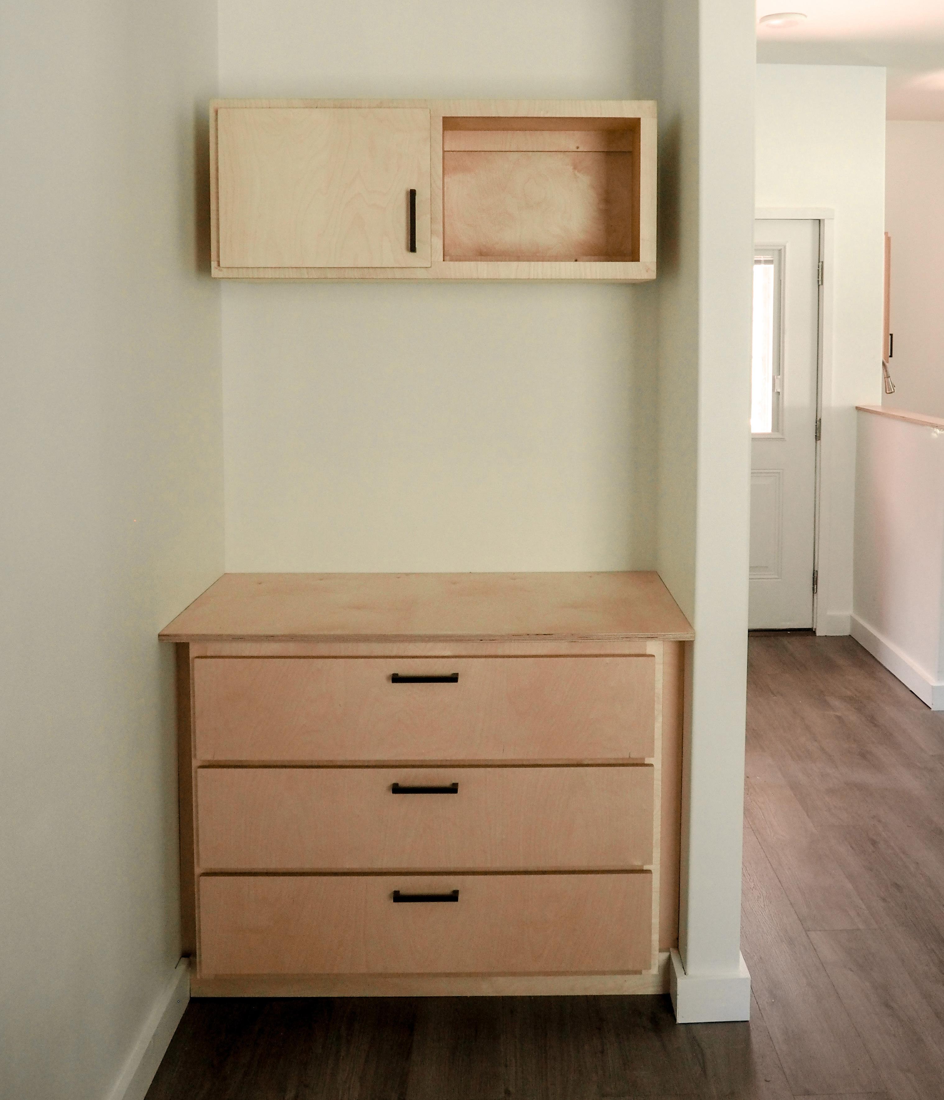 The main reason for revisions to the previous iterations of the cabinets for Mrs. Ophelia’s Home was to improve of the modularity. We wanted to have a small collection of cabinets, drawers, and shelves that could be modified slightly, typically by adjusting the size, to adapt to the intended area of installation. Examples of where it was necessary to break the modularity include the small double cabinets in the kitchen above the stove and fridge and also the set of drawers in the nook which were widened to expand from one wall to the other.