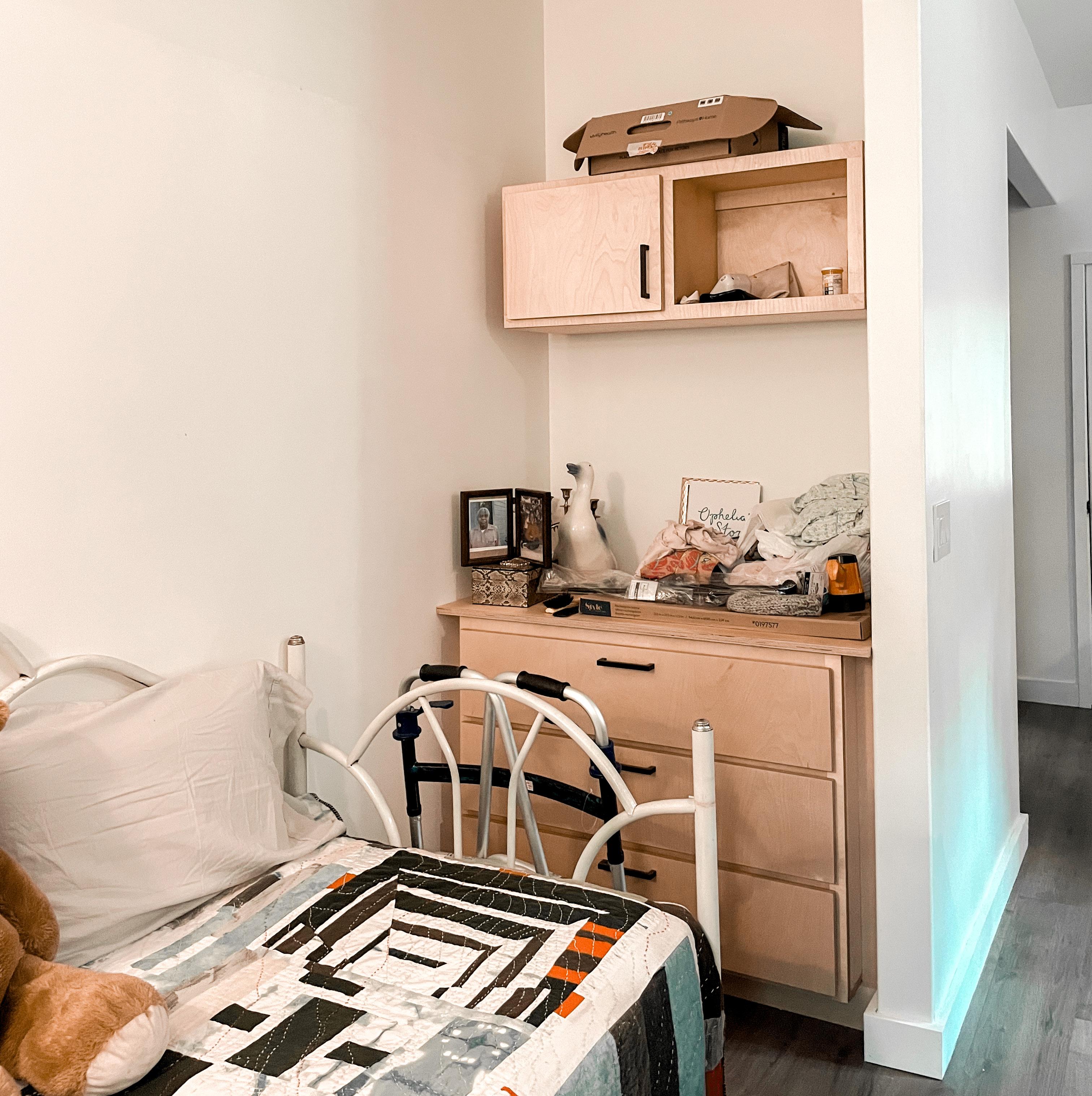 We began by re-designing the cabinetry for Ms. Ophelia. The cabinets were designed to meet her individual needs, but were also standardized so they could be used for future homes or other organizations such as Front Porch Initiative.