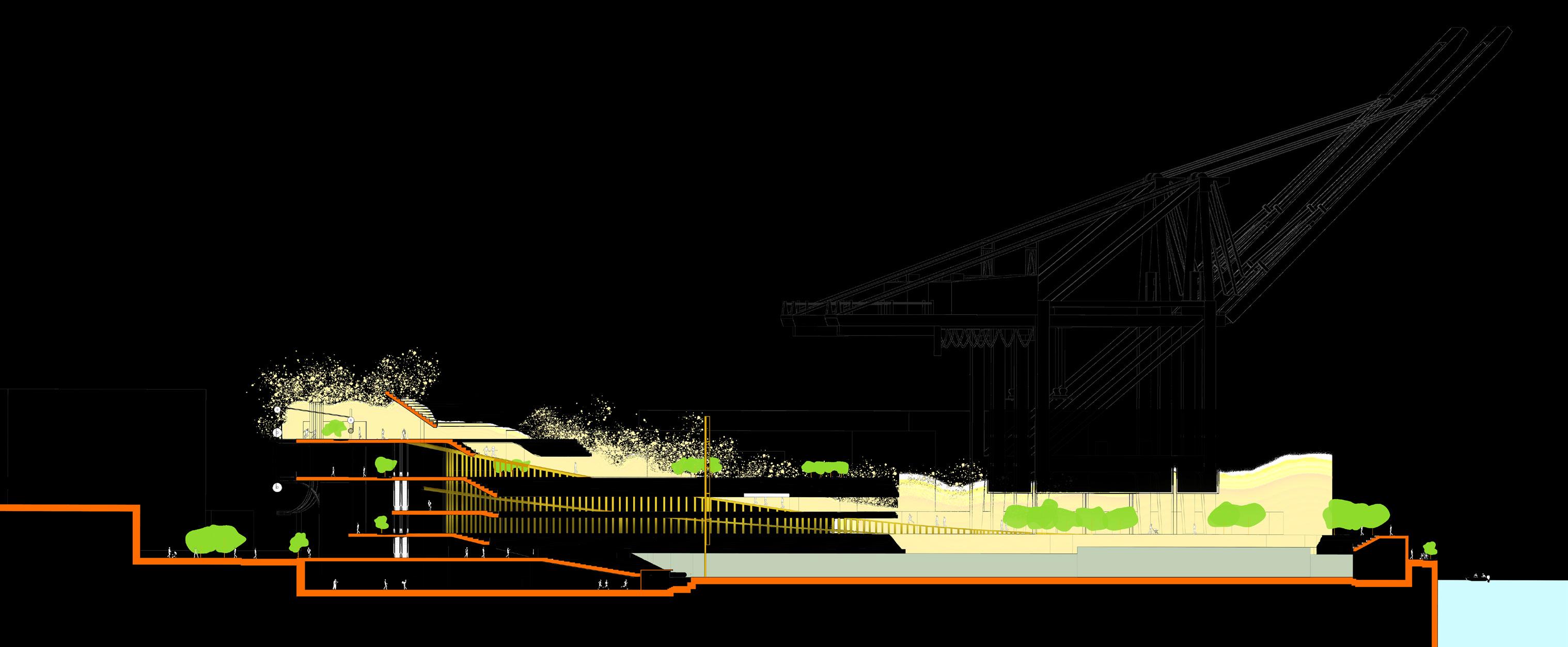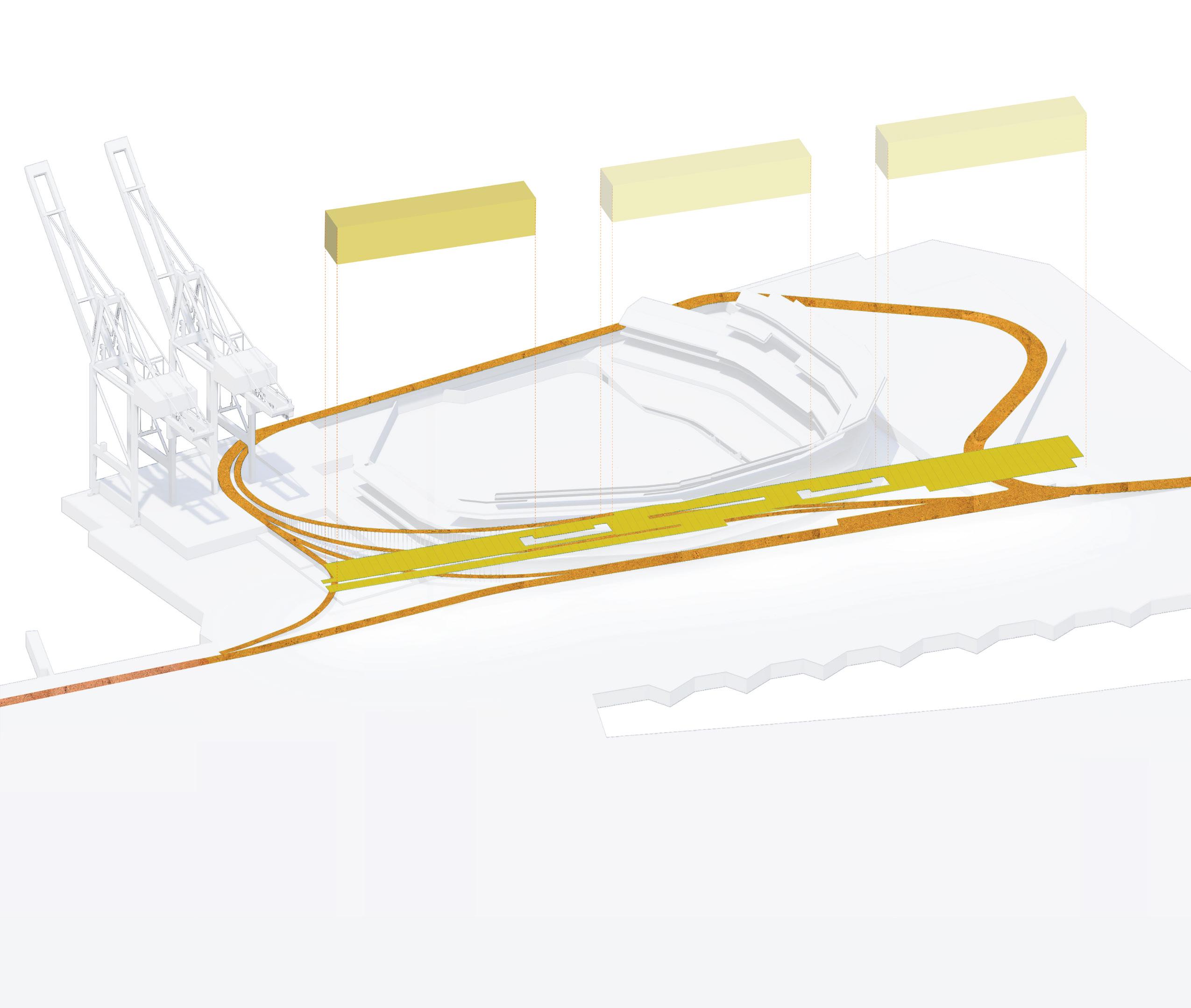 Creating a home for the Oakland Athletics that would be a source of pride for the community, was the main goal for this project. This was achieved through maintaining the integrity of the site. As the original site was used as a prominent shipping port in an industrial area of Oakland, it was essential to maintain that same language throughout the new development while demonstrating the future growth of the city. This is seen through the materials used, the available public space, and analog interactive opportunities that are scattered around the site.