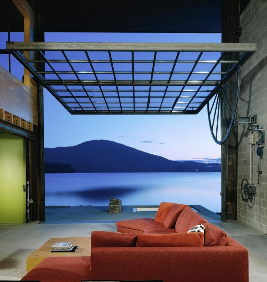 Tom Kundig’s Chicken Point Cabin in northern Idaho uses analog transformative mechanisms as a way to bring in the sweeping views from the lake into the home in an attempt to combine architecture and nature. Kundig implements a hand powered crank that controls the nineteenfoot tall, six-ton steel and glass structure in an effort to enhance the experience of opening up the living space to the lake.16 Because there is a mechanical gizmo that assists the analog mechanism, even a small child can miraculously lift the heavy steel window, revealing the vast landscape of the lake. This connection is further emphasized by a shiny concrete slab that seamlessly blends the living space onto the