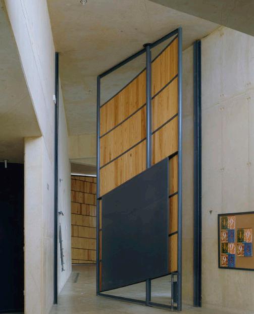 Enric Miralles used analog transformative mechanisms in the Morella Boarding School to provide a playful element to the space. Mirallas incorporates a large red steel gate at the entrance of the school that pivots as a result of children using their entire body to bring the mechanism alive.3 This display of transformation gives students a positive self-confirming sense of accomplishment as their small bodies are somehow able push this massive gate open. Mirralles also uses analog mechanisums that lead to the main hall by placing large operable panels at the entrance of the space.4 This not only transforms the condition of the hall when moved but also contains a similar