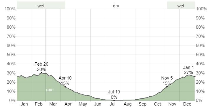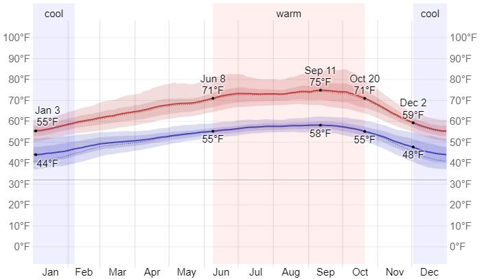 Oakland, California has a Mediterranean climate, which means it has mild, wet winters and dry summers. The average high temperature in the summer is in the mid-60s to low-70s fahrenheit, while the average low temperature in the winter is in the mid-40s to low-50s fahrenheit.