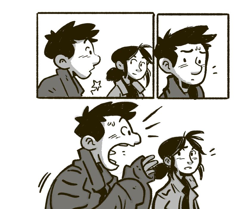 Kohautan mun harteita. Mitä mä tälle maisemalle mahdan? Me leikitään arvausleikkiä, jossa pitää arvata, mitä näköpiirissä olevaa asiaa toinen ajattelee, mutta se alkaa toistaa itseään. Me ollaan istuttu jo tosi kauan tässä samassa kohdassa katsomassa tätä samaa maisemaa.