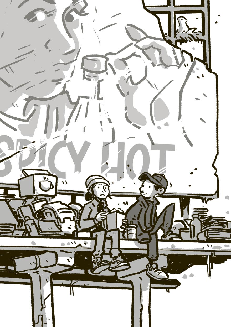 Megaostari sai meidät lopulta kiinni ja parkkeerasi itsensä läheisen ylikulkusillan alle. Mä ja June käytetään sitä meidän komentokeskuksena. Me mennään joka