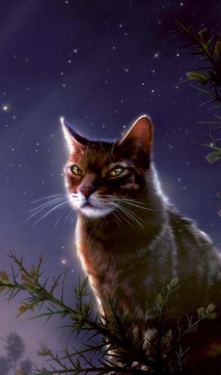 Korkokivien takana leijuva pitkä pilvenlonka alkoi rakoilla, ja sen läpi työntyvät laskevan auringon säteet saivat huiput hehkumaan. Kaukana niiden alapuolella variksenmustat varjot kasvoivat kohti kiviä. Harmaa Siipi istui nummen reunalla turkkia pörröttävässä iltatuulessa ja nosti katseensa kohti taivaanrantaa siristäen silmiään auringon loimotuksessa. Kilpikonnan Häntä liikahti hänen vieressään ja kehräsi hiljaa.